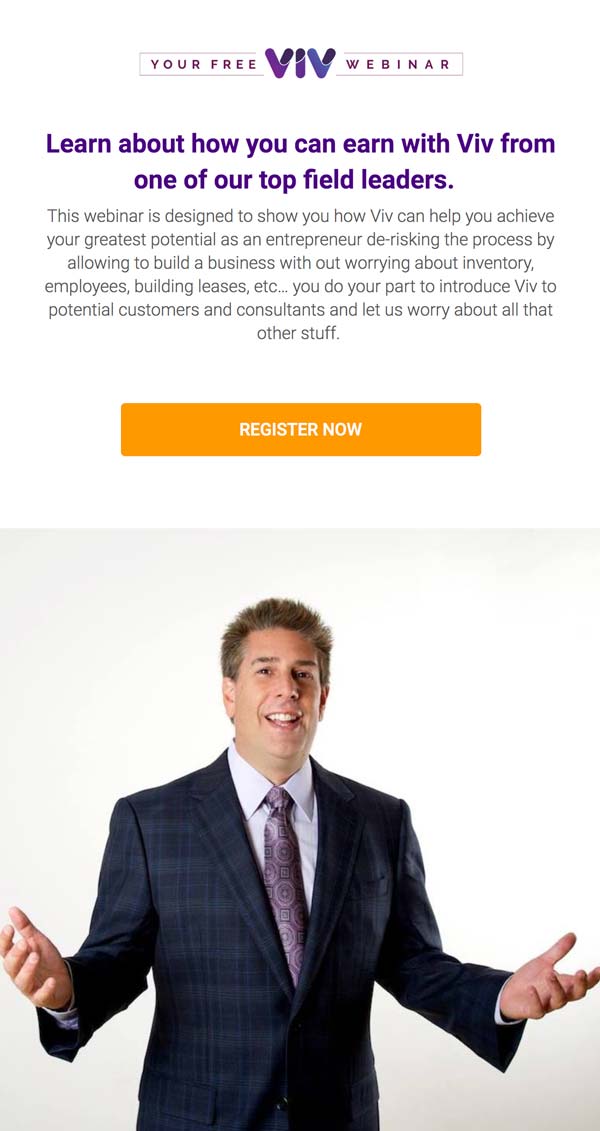 Hey, I’m so glad you are interested in hearing more about Viv! Here is the webinar I told you about, hosted by Kevin Marino. He’s a longtime network marketer who has hit the 7-figure mark three times! He hosts these every day at 6 pm ET, and the webinar will last about 20 minutes. I can’t wait to hear what you think!